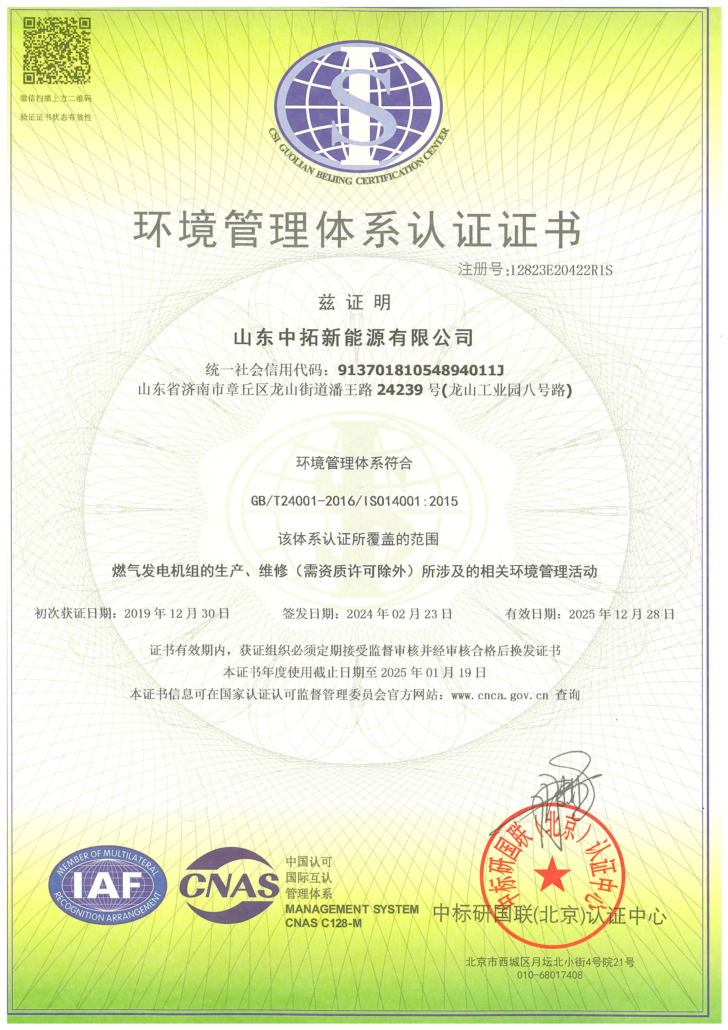 環(huán)境管理體系認證證書